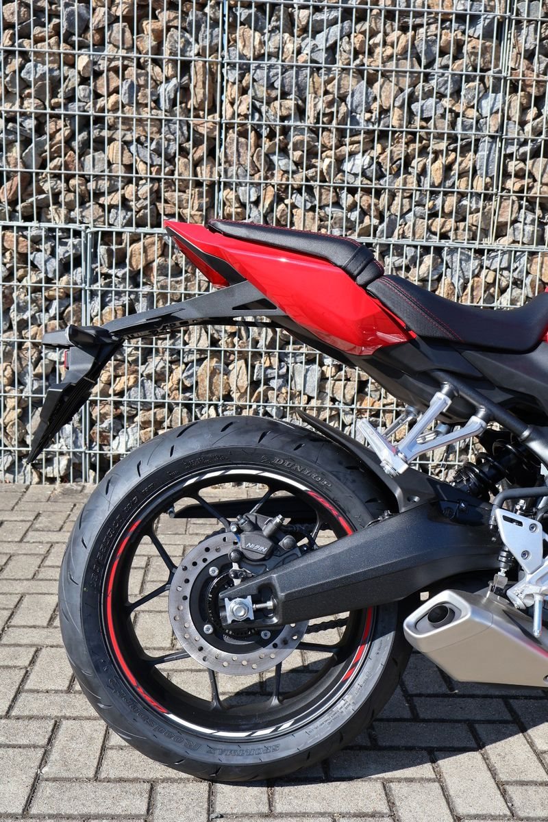 The Honda CBR650R is a great mid-range supersports bike for the country road, which manages the balancing act between sportiness and accessibility very well. But other bikes in this class also manage this. What makes the CBR special is the old-school in-line four-cylinder engine at its heart. You won't win any acceleration races with it, but the in-line four inspires with its silky power delivery and screaming revviness in the upper rev range. And with the new E-Clutch technology, you can get the most out of the engine with crisp gear changes and massively increase comfort in city traffic thanks to the electronic operation of the clutch.