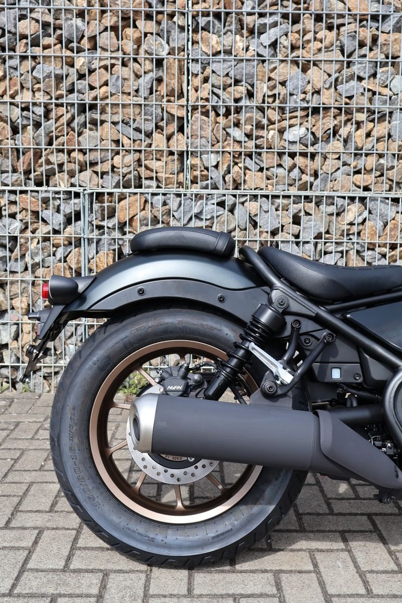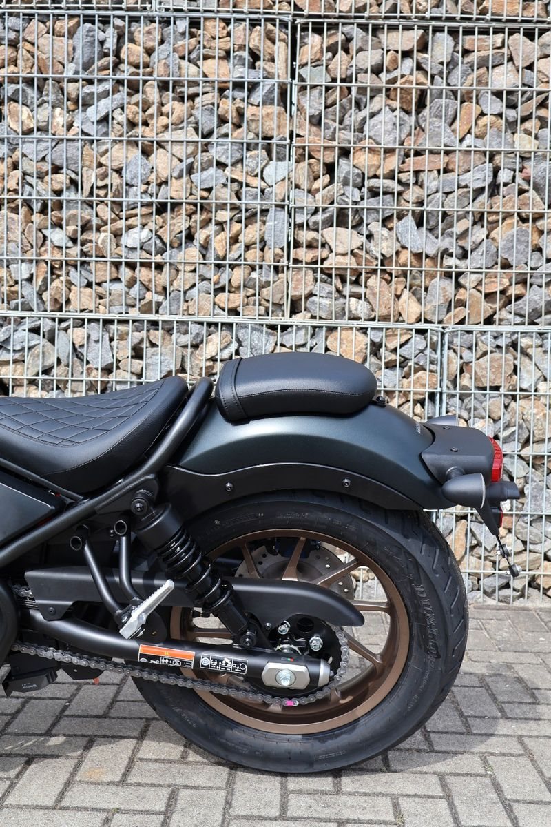 Der bewährte Zweizylinder-Reihenmotor sorgt für ein berechenbares, sanftes und gleichmäßiges Ansprechverhalten - ideal, wenn du von einem kleineren Motorrad auf die Rebel umsteigst. Dank des neuen Auspuffs ist die Maschine jetzt EURO5-konform, während die Anti-Hopping-Kupplung den Kraftaufwand für das Schalten um 30 % verringert. Die entspannte Fahrposition mit ausgestreckten Armen und niedriger Sitzhöhe ist genau richtig für die Autobahn. Dabei ist die Rebel auch bei niedrigen Geschwindigkeiten komfortabel und leicht zu kontrollieren.