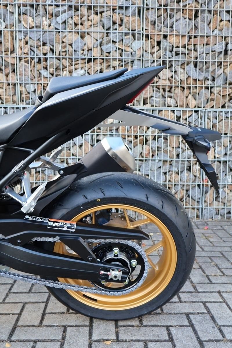Hier ist alles echt. Das ist das Motorrad in seiner rohesten Form, straff definiert. Die kompromisslose Streetfighter-Attitüde der CB1000 Hornet wird durch den markanten, superkompakten LED-Doppelscheinwerfer unterstrichen, der passgenau in der diskreten Frontverkleidung sitzt. Der dezent geschwärzte Rahmen bringt ein starkes Element des geschmeidigen Designs mit sich und unterstreicht die Linienführung ebenso wie der hintere Hilfsrahmen im Spalierstil. Um ihr einen aggressiven Look zu verleihen, sind der Motor, die Räder und die Schwinge ebenfalls in Schwarz gehalten. Und der für die Hornet charakteristische, breitschultrige Kraftstofftank, der sich radikal nach hinten verjüngt, steht für pure Leistung.