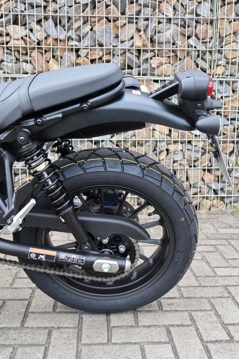 Die ikonische Optik beginnt beim 12-l-Kraftstofftank: glatt, rund, perfekt geformt und mit bequemen Gummikniepolstern. Alle Bauteile, bei denen dies möglich ist - Motor, Rahmen und Fahrwerk - sind tiefschwarz lackiert, was zum minimalistischen Erscheinungsbild beiträgt. Wie in den guten alten Zeiten sind die Gabeltauchrohre durch Faltenbälge aus Gummi geschützt. Der hohe und ausladende Lenker ermöglicht ein ausgezeichnetes Handling und harmoniert bestens mit dem hochgelegten Auspuffschalldämpfer mit dem perforierten Edelstahl-Hitzeschild und den Doppelrohren, die genau an der richtigen Stelle sitzen.