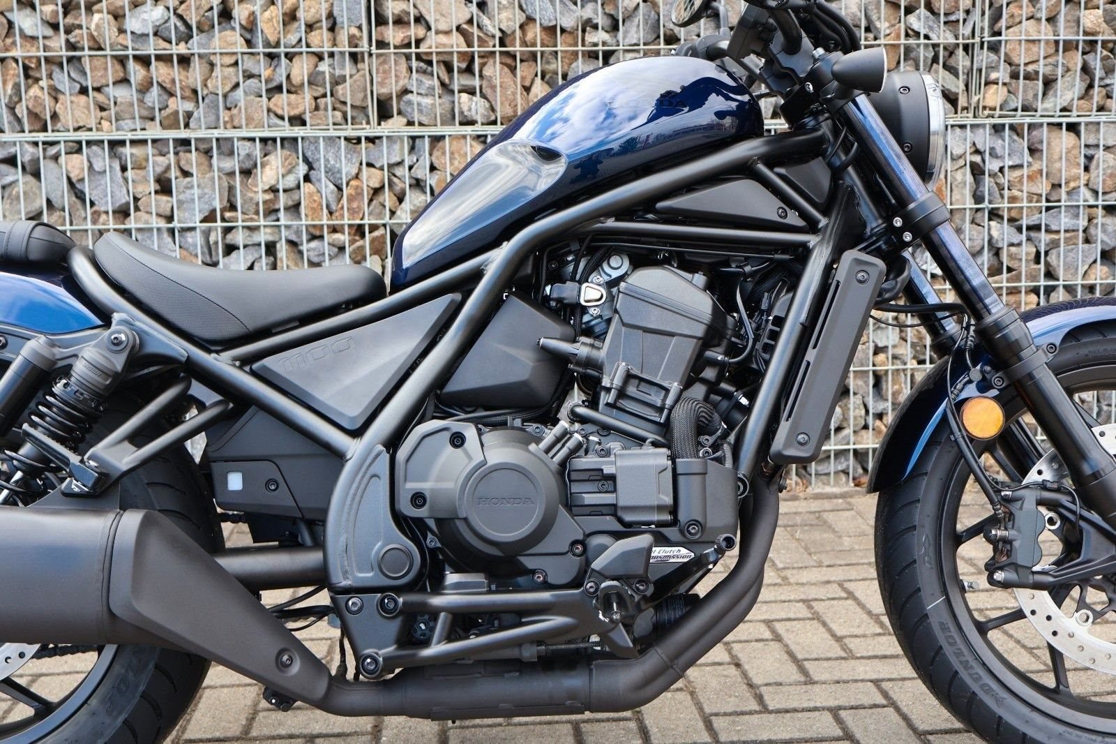 Der Stahl-Hauptrahmen ist ein echtes Design-Statement und besteht aus 35-mm-Rohren, die zusammen mit der robusten Schwinge mit einem Durchmesser von 50,8 mm den langen und niedrigen Bobber-Look erzeugen. Lass dich davon jedoch nicht täuschen. Dieses Motorrad will nicht nur bewundert, sondern auch gefahren werden. Wir haben also ein paar Anpassungen an der Sitzposition vorgenommen, die auf dem Feedback von Leuten basieren, die es wirklich wissen müssen: Rebel-Besitzer. Der Lenker ist 28 mm nach hinten gezogen und 12 mm angehoben. Die Fußrasten sind 50 mm nach vorne gerückt und der Sitz - mit neuem, hochwertigem Urethanschaum - ist 10 mm dicker für eine (immer noch niedrige) Sitzhöhe von 710 mm. Das Ergebnis? Viel mehr Platz für Fahrer von unterschiedlicher Größe sowie entspanntere Fahrt mit mehr Komfort und Kontrolle.